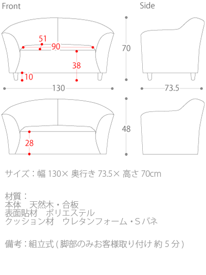 シンプルながらも特徴ある居心地のいいデザインで、温かみのある快適なお部屋を作りませんか? サイズ:幅130×奥行き73.5×高さ70cm 材質: 本体 天然木・合板 表面貼材 ポリエステル クッション材 ウレタンフォーム・Sバネ備考:組立式(脚部のみお客様取り付け 約5分 カテゴリー:ラブソファ/ローソファ/2人掛け/2P/ファブリックソファ/リビング/シンプル/モダン/北欧/布製/ブラウン/グレー/レッド/modernサイズ: 幅130×奥行き73.5×高さ70cm 材質: 本体 天然木・合板 表面貼材 ポリエステル クッション材 ウレタンフォーム・Sバネ 備考: 組立式(脚部のみお客様取り付け 約5分)