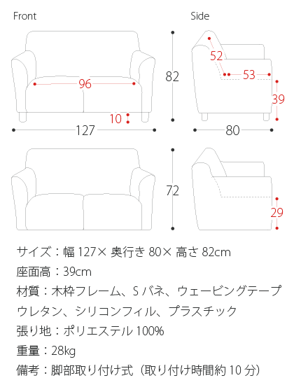 サイズ:幅127×奥行き80×高さ82cm、座面高:39cm 材質:木枠フレーム、Sバネ、ウェービングテープ、ウレタン、シリコンフィル、プラスチック、張り地/ポリエステル100% 重量:約28kg 備考:脚部取り付け式(取り付け時間約10分)※2015年1月6日販売分より、脚部のデザインが変更となっております。