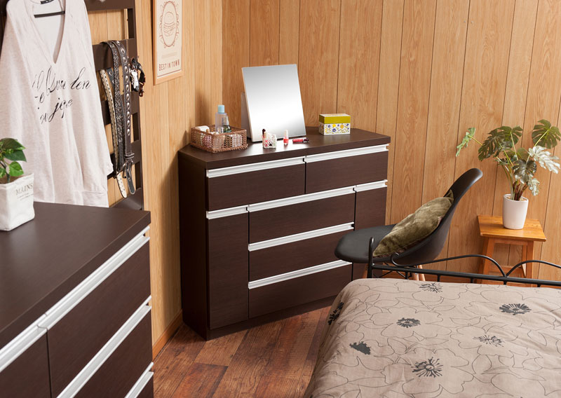 上部の左右にある小引出しは変則的な収納部でオープンスペースがあり引出しには靴下や下着などを収納して、オープンスペースには化粧品など色んな小物の収納に便利です。