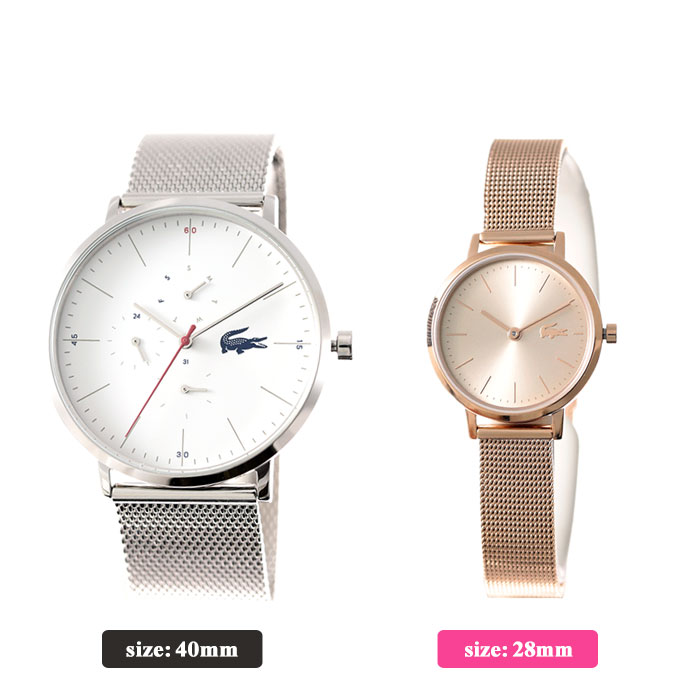 型番 PAIR-LACOSTE-200915-36 ケース材質:ステンレススティールサイズ約:40mm / 28mm重さ:72g / 34gベルト材質:ステンレススティールベルト腕周り最大:20cm / 18cmムーブメントクォーツ(電池式)機能風防素材:ミネラルクリスタルガラス防水機能防水性:日常生活用防水付属品ラコステ[LACOSTE]特製ギフトBOX保証書取扱説明書※説明書・保証書に関して入荷時期により仕様、内容が一部異なる場合がございます。