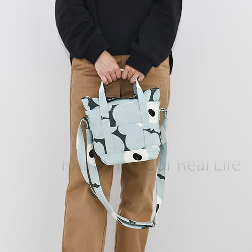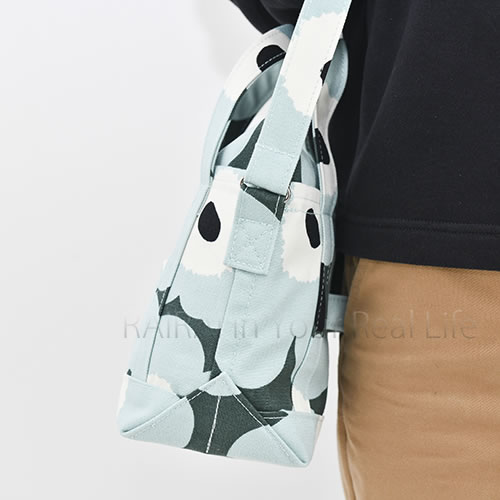 商品名 PIENI UNIKKO MILLI MATKURI 2wayトートバッグ ブランド marimekko マリメッコ デザイナー (テキスタイル) Maija Isola サイズ 約 縦 24 cm × 横 26.5 cm × マチ 12 cm ストラップ全長 142 cm 材 質 100%コットン その他 ※生地の取り方により柄の配置は1点ずつ異なります。